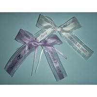 50 PERSONALIZED RIBBONS For Wedding, Baby shower, Bridal shower, Birthdays, Anniversaries, Christening, Graduation, Parties, QuinceaƱera and other Special Occasions. Perfect for making Bows to attach to your favors Ribbon is a High Quality 7/8" Wide Satin and organza Ribbon Colors: Mint, Peach, Light Pink, Lavender, Mauve, Red, Fuschia-Hot Pink, Burgundy, Purple, White, Ivory, Yellow, Silver, Navy Blue, Light Blue, Royal Blue, Black, Emerald Green, Orange and brown Ribbon Length : 15 Imprint color: Silver, Gold, Metallic Red, Metallic Blue, Metallic Green, Metallic Fuschia, Mosaic(Rainbow foil), Flat Purple, Black, Light Blue flat, Burgundy flat, , Navy Blue flat, Pink flat, Royal Blue flat, White, Lavender flat Imprint LOGOS: Umbrella, Stork, "Baby", Bassinet, Doves, Toasting Glass, 50th, Bells, Double Hearts, 25th, Cross, double birds a Dove, Praying Hands, Rattle, Graduation Hat Personalized message will be printed using Goudy Cursive 18pt. Maximum Print space for the personalized message is 40 characters (space counts as 1 character and logos as 5characters). We suggest that you balance the space on the left and right tails of the ribbon approximately 18-20 characters so the ribbon won't look odd. Still, we will personalized it the way you want it to be. We also reserve the right to edit your details to make it more appropriate to the ribbon. Personalized ribbons are not returnable. (ribbon comes on a bolt)PLEASE provide the following information for personalization 1. ribbon color 2. print color 3. length 4. logo and where 5. right tail print 6. left tail print