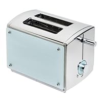 With its sleek, contemporary design, this two-slice toaster brings a new level of sophistication to breakfast time. The unit features a polished stainless-steel exterior with screwed-on decorative frosted-glass plates on both sides for a unique appeal that won't go unnoticed. More than just good looks, however, the appliance comes equipped with a variable browning-control dial for adjusting the shade from light to dark, a cylinder-shaped stainless-steel lowering lever, and 1-1/2-inch-wide slots that will accommodate bagels, English muffins, and even thick slices of homemade bread. It also provides chrome buttons for cancel, defrost, and reheat/bagel functions with blue LED indicators. Other thoughtful details include a slide-out crumb tray for quick cleanup and cord storage underneath the unit to help keep counters looking tidy. The 850-watt two-slice toaster measures 12 by 7 by 7 inches and carries a one-year warranty.
