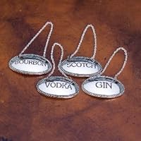 SET OF 4 SILVER PLATED LIQUOR LABELS These elegant liquor tags are the perfect addition to the upper class bar! Designed with a hanging chain to fit any bottle, these oval labels will complement your favorite liquors. A set of four tags, engraved; Bourbon, Scotch, Vodka, and Gin. This set will suit any taste! Made of silver-plated material, these chic tags will make a statement!