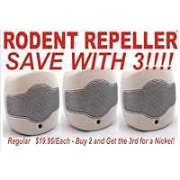 3 pack of Single Speaker Rodent Repellers. Non-toxic ultrasonic rodent repellers are specifically designed to repel rats & mice, the most common indoor rodent pest problem encountered by consumers worldwide. Rats and mice pose serious health risks, and traps and poisons come with a heavy price. Poisons can endanger children and pets while inhumane traps require the handling of potentially disease-bearing rodents. Neither poisons nor traps provide long-term protection since more rodents will likely replace the ones you've killed. It can be an unending cycle. Ultrasonic or Electronic Rodent Repeller puts the emphasis on non-toxic prevention, instead of after-the-fact toxic intervention. Ultrasonic rodent repellers emit high frequency ultrasound waves between 32 and 62 kHz to create an acoustically hostile environment that repels rodents from sound-protected areas, over the long term. Ultrasound is kinder than traps, safer than poisons, and inaudible to people and non-rodent pets. The physical properties of ultrasonic sound prevent ultrasonic sound waves from penetrating solid objects like walls and floors. Therefore it is recommended to place one rodent repeller in each room of the location being treated for rodents. Ultrasonic waves are highly directional and will bounce off of hard surfaces to fill an enclosed area with high intensity echoes. Hard surfaces are cement, brick, glass, tile, etc. On the other hand, ultrasound is absorbed and dampened by soft surfaces, such as hay bales, feed sacks, stacked linens, etc.Go Green and Make an Impact!