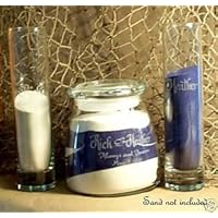 This unity sand ceremony set includes a covered 27oz.center jar with 2 8oz pouring vases. Personalized with names, a date and a short message on the center jar and a name etched on each of the side pieces. Examples of short messages: (1) Always and Forever (2) Today, Tomorrow, Always or your own (10 word maximum) Our etching style is unique freehand calligraphy style and is the only style available. Additional pouring vases are available for purchase by searching Amazon for item number B002976J8Y. They are $7.49 ea. + S/H/ Sand is for display only and is not included.IMPORTANT: because there is no form in this listing for the etching instructions please either Email your etching instructions or leave this information in the "Gift message" section. .